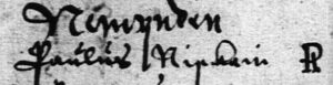 Vuoden 1623 maakirjan lautamiesluettelo ja lautamies Paavo Niskasen (n. 1583-1634) puumerkki (nimen oikella puolella R-kirjainta muistuttava).
