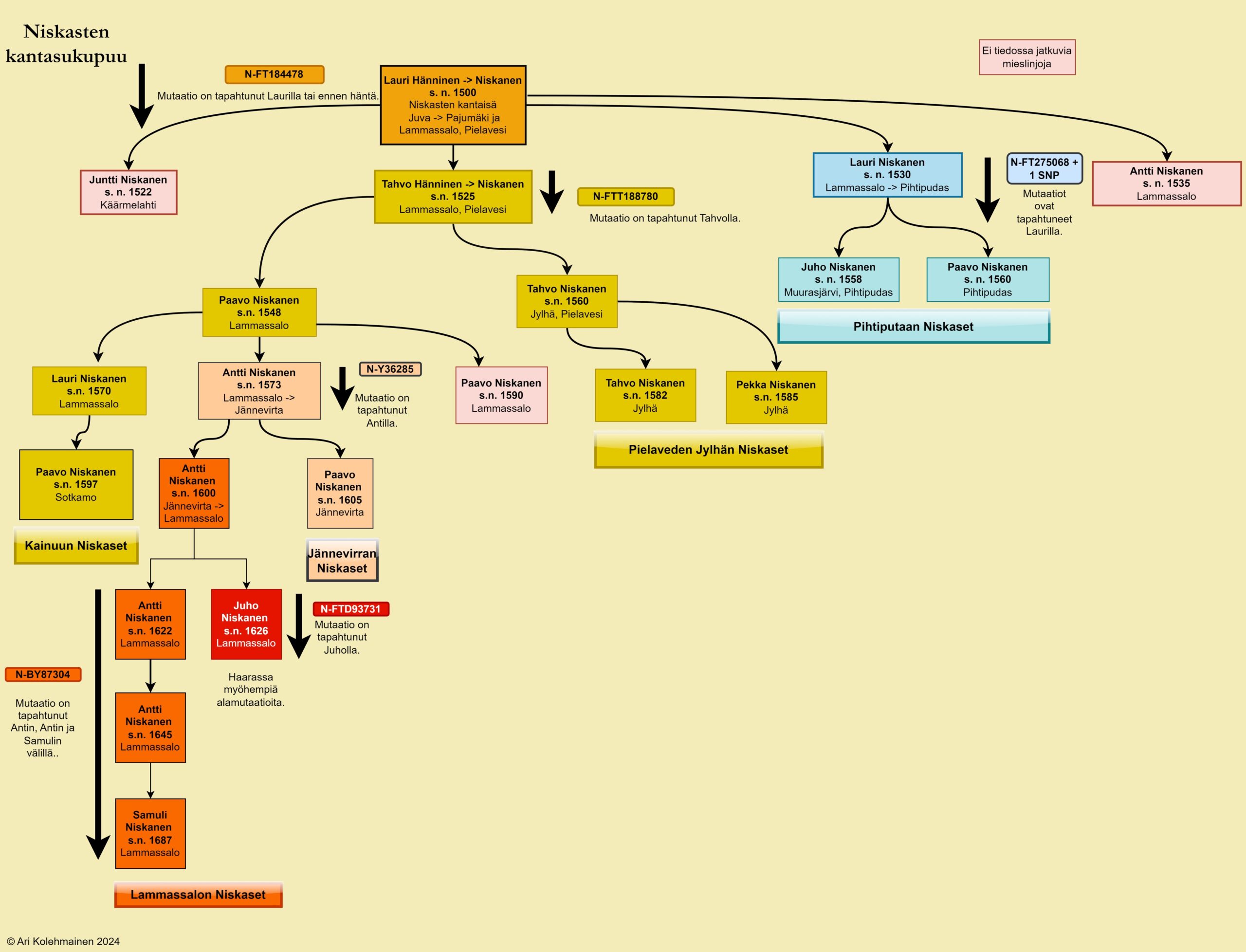 Niskasten kantasukupuu, Ari Kolehmaisen esittämä (sukukokous 2024 Runni) Niskasten kantasukupuu DNA tulosten pohjalta